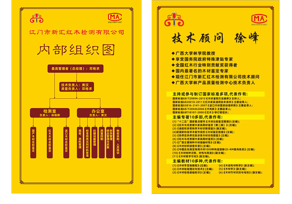 江門(mén)市新匯紅木檢測(cè)有限公司位于中國(guó)古典家具三大流派“廣作”的發(fā)源地廣東新會(huì)的紅木專(zhuān)業(yè)市場(chǎng)新會(huì)古典家具城。在中國(guó)古典家具之都博覽中心的三樓擁有日常檢測(cè)及辦公場(chǎng)地約625平方米,由國(guó)內(nèi)紅木材質(zhì)鑒別三大權(quán)威專(zhuān)家之一、享受?chē)?guó)務(wù)院特殊津貼的廣西大學(xué)林學(xué)院徐峰教授任總顧問(wèn)。公司技術(shù)力量雄厚、檢測(cè)儀器先進(jìn)齊全,可開(kāi)展木塊取樣及家具無(wú)損檢測(cè)。擁有多名木材研究博士、碩士、中級(jí)工程師、助理工程師等科研人員和多名專(zhuān)家顧問(wèn)團(tuán)隊(duì),每年在專(zhuān)業(yè)雜志刊物發(fā)表論文多篇;擁有國(guó)內(nèi)外紅木及名貴硬木木材標(biāo)本200多種,永久顯微切片300多種;每年開(kāi)展紅木檢測(cè)業(yè)務(wù)4,000單以上。同時(shí)公司還擁有進(jìn)口高新技術(shù)設(shè)備工業(yè)CT射線(xiàn)透視儀、3D立體彩色掃描儀等先進(jìn)設(shè)備,對(duì)家具質(zhì)量進(jìn)行專(zhuān)業(yè)檢測(cè)并提供產(chǎn)品質(zhì)量的參考意見(jiàn)。
